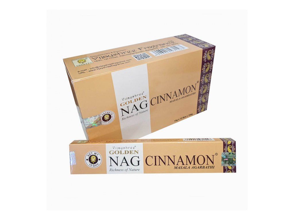 Golden Nag - Cinnamon 15g je vyrobené zo 100% prírodných materiálov, bez akýchkoľvek chemických prímesí. Obsahuje Plumeriu, známu viac ako Frangipani. Zmes polokvapalných živíc, prevzatých zo stromu Ailanthus malabarica im poskytuje charakteristickú krémovú farbu a vlhkú textúru. Po ich zapálení sa vo vašej miestnosti vyskytne veľmi príjemná vôňa po dlhú dobu a vytvorí Vám príjemnú atmosféru. Sú ručne šúlané v Indii pomocou čistých výťažkov a najjemnejších vonných olejov.