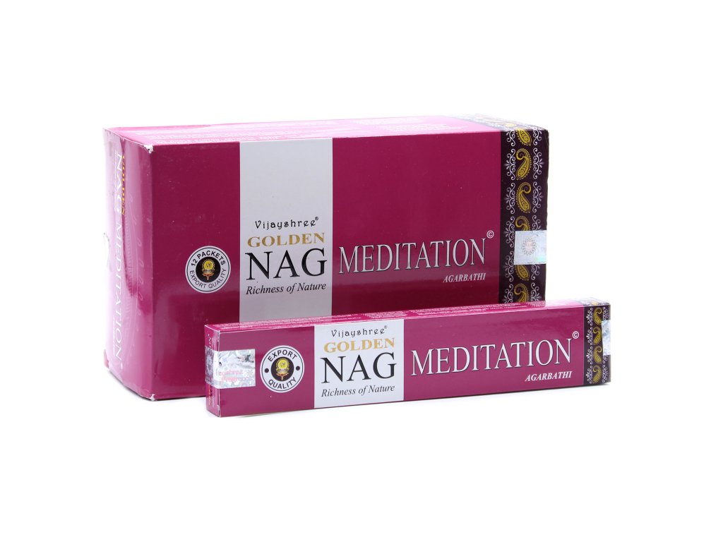 Golden Nag - Meditation 15g sú vyrobené zo 100% prírodných materiálov, bez akýchkoľvek chemických prímesí. Obsahuje Plumeriu, známu viac ako Frangipani. Zmes polokvapalných živíc, prevzatých zo stromu Ailanthus malabarica im poskytuje charakteristickú krémovú farbu a vlhkú textúru. Po ich zapálení sa vo vašej miestnosti vyskytne veľmi príjemná vôňa po dlhú dobu a vytvorí Vám príjemnú atmosféru. Sú ručne šúlané v Indii pomocou čistých výťažkov a najjemnejších vonných olejov.