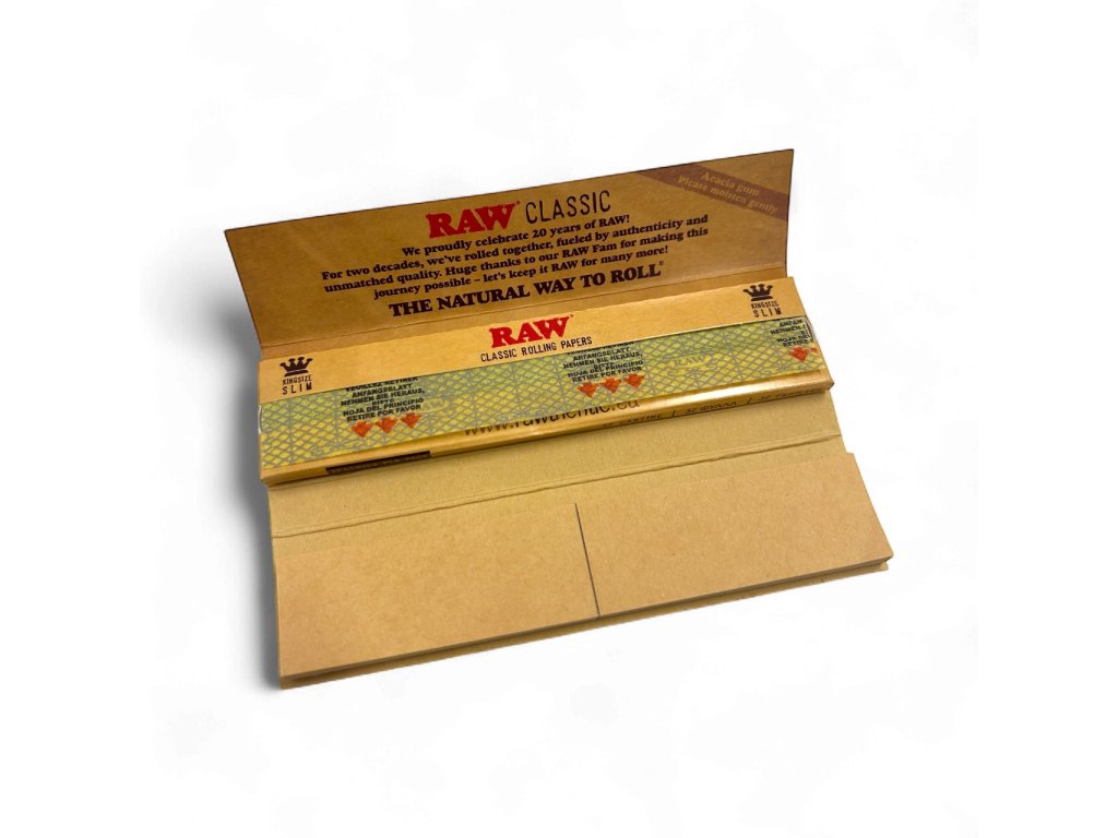 RAW Organic Connoisseur KS Slim + Tips papieriky a trhacie filtre v jednej brožúrke. Eco-friendly vyrobené papieriky z organického konope. Papierik horí extrémne pomaly a veľmi jemne.